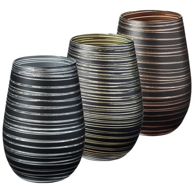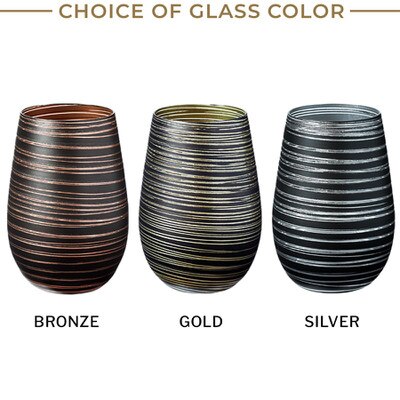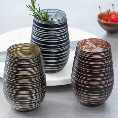 Noir Swirl Stemless Glasses Set of 6 (P/N 36449). Starting with our Noir Stemless glass, we've added streaks to highlight the colored glass.