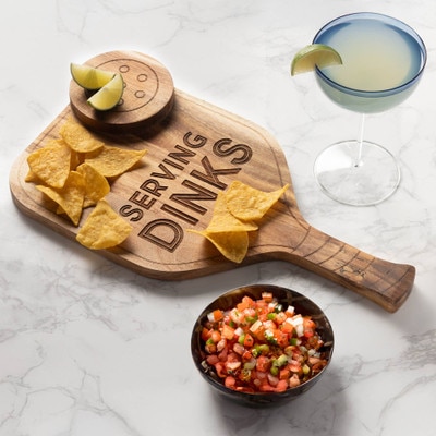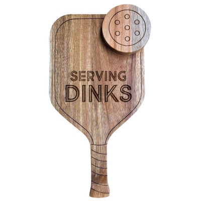 Pickleball Cheese Serving Board (P/N 37086). Made from natural Acacia wood, this charcuterie board is the ideal gift for all pickleball fans. The board is shaped like a pickleball racquet and includes an attached, slightly raised ball.